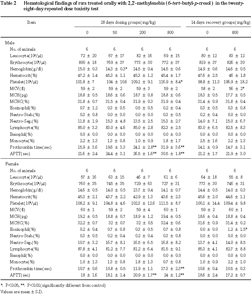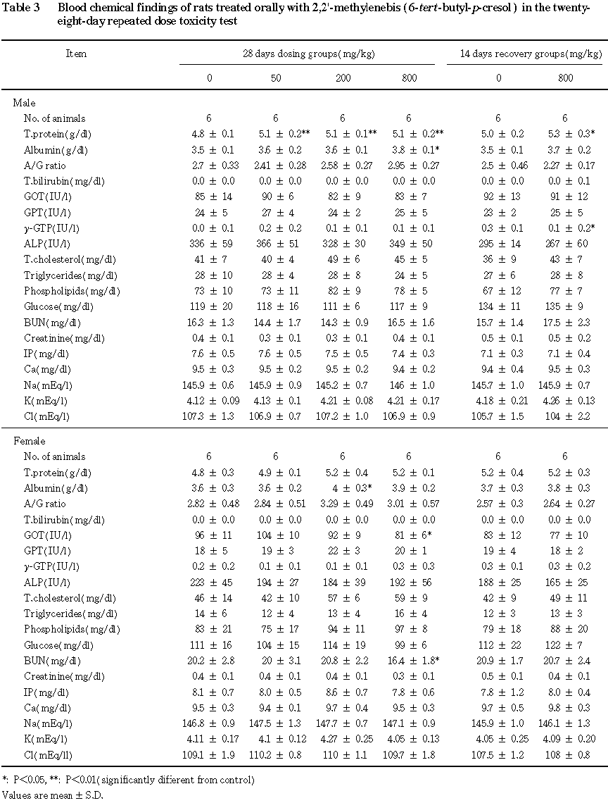 上記のほか,投与期間終了時の変化として,血液学的検査で 50 mg/kg群の雄にヘモグロビンの軽微な減少が,800 mg/kg群の雄に血小板数の軽微な増加がみられ,血液生化学的検査で800 mg/kg群の雌にGOTの減少および尿素窒素の減少がみられたが,極めて軽微な変化であること,片性のみの変化であることあるいは関連する他のパラメータに変化がみられないことから,被験物質投与による変化とは考えられなかった.また,回復2週目あるいは回復期間終了時では,尿検査,血液学検査,血液生化学検査,剖検および器官重量測定において軽微な変動がみられたが,投与4週目あるいは投与期間終了時の検査では変化はみられないことや関連する他のパラメーターに変化がないことから,毒性学的意義のない変化と思われた.