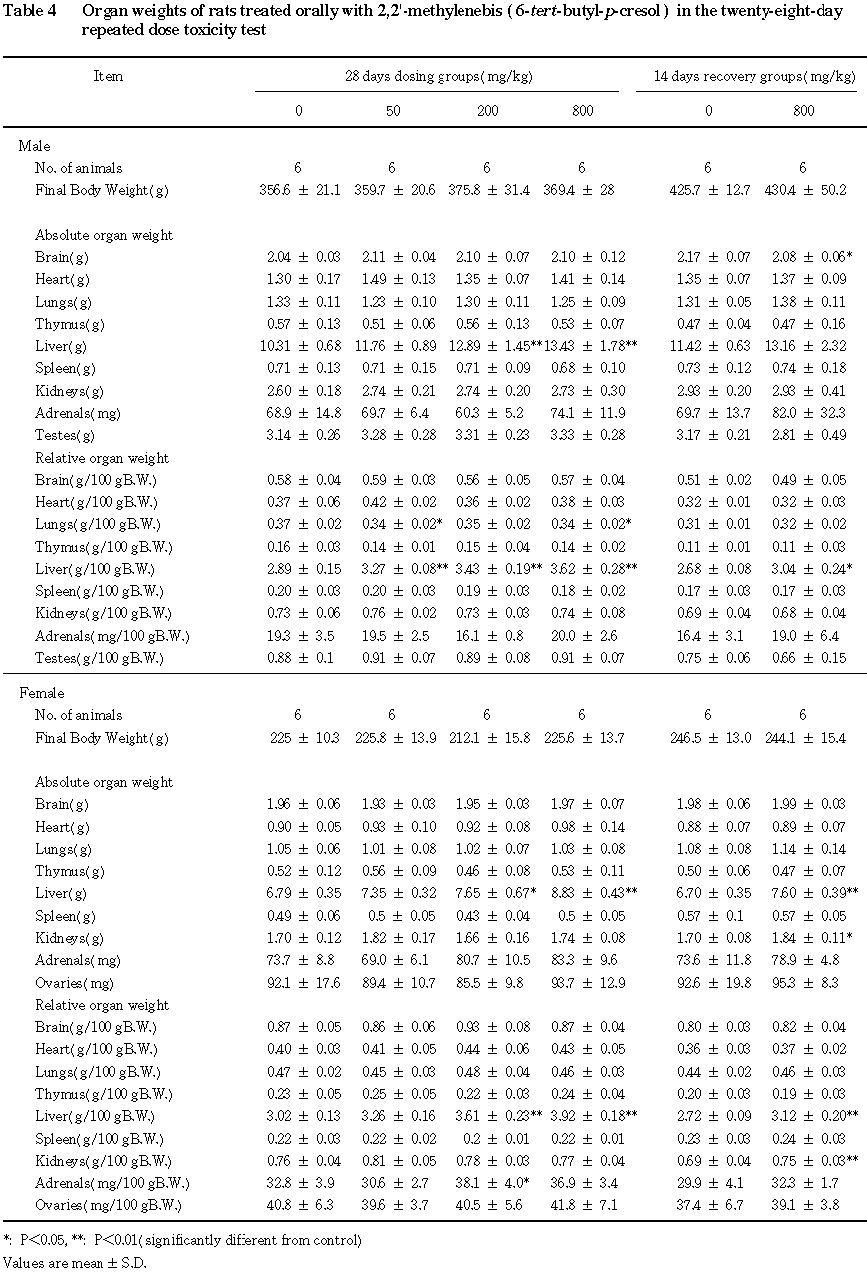 回復期間終了時には,雌雄の 800 mg/kg群で肝臓の絶対および相対重量の増加がみられたが,その程度は投与期間終了時に比べて小さかった.また,雄の800 mg/kg群で脳の絶対重量の軽微な減少がみられ,雌の800 mg/kg群で腎臓の絶対および相対重量の軽微な増加がみられた.