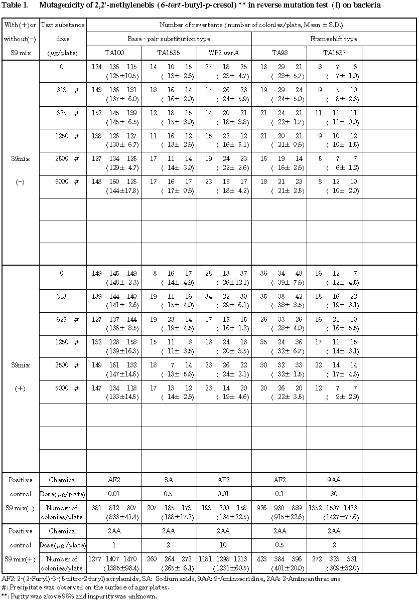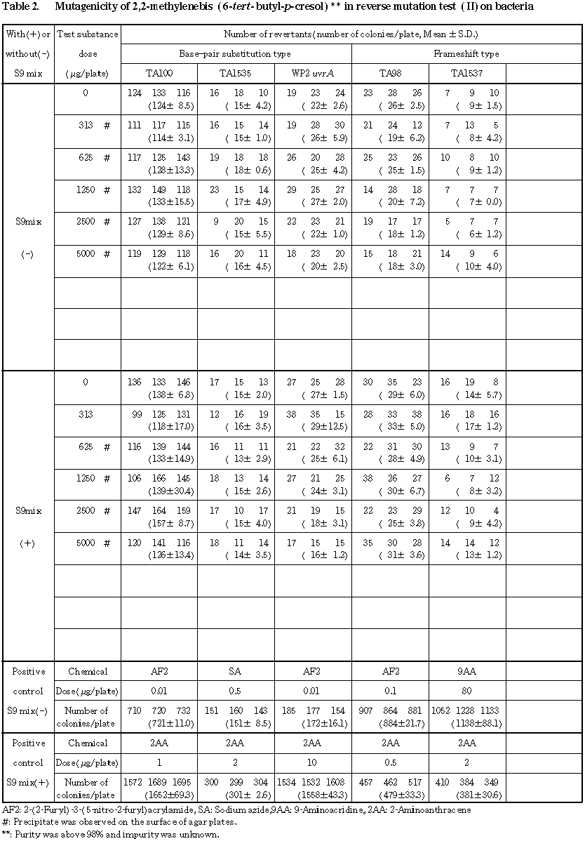 ¤½¤Î·ë²Ì¡¤Éüµ¢ÊѰۥ³¥í¥Ë¡¼¿ô¤Ï¡¤ 2²ó¤ÎËܻ¤È¤â¡¤ÍѤ¤¤¿¤¹¤Ù¤Æ¤Î¸¡Äê¶Ý¤Ë¤ª¤¤¤Æ¤¤¤º¤ì¤ÎÍÑÎ̤ˤª¤¤¤Æ¤â¡¤Áý²Ã¤Ïǧ¤á¤é¤ì¤Ê¤«¤Ã¤¿¤³¤È¤«¤é¡¤2,2'-¥á¥Á¥ì¥ó¥Ó¥¹(6-tert-¥Ö¥Á¥ë-p-¥¯¥ì¥¾¡¼¥ë)¤Ï¡¤ÍѤ¤¤¿»î¸³·Ï¤Ë¤ª¤¤¤ÆÊѰ۸¶À¤òͤ·¤Ê¤¤(±¢À)¤ÈȽÄꤵ¤ì¤¿¡¥