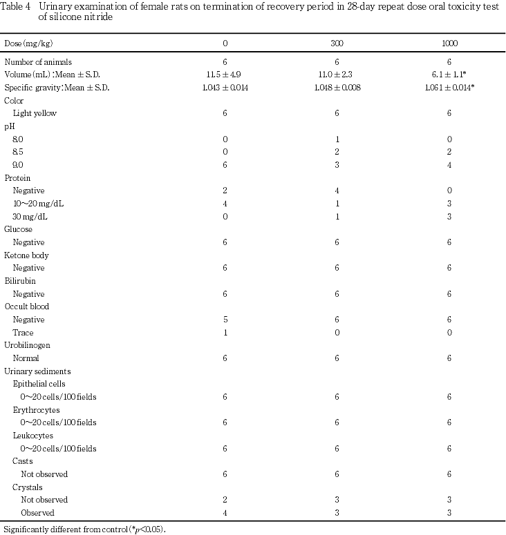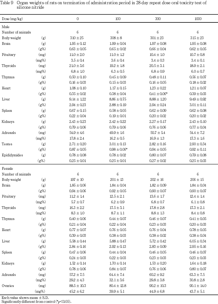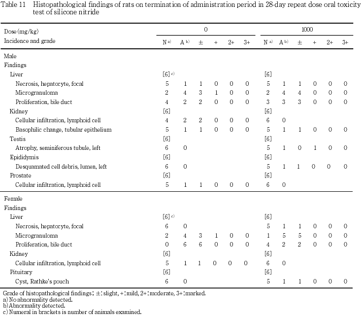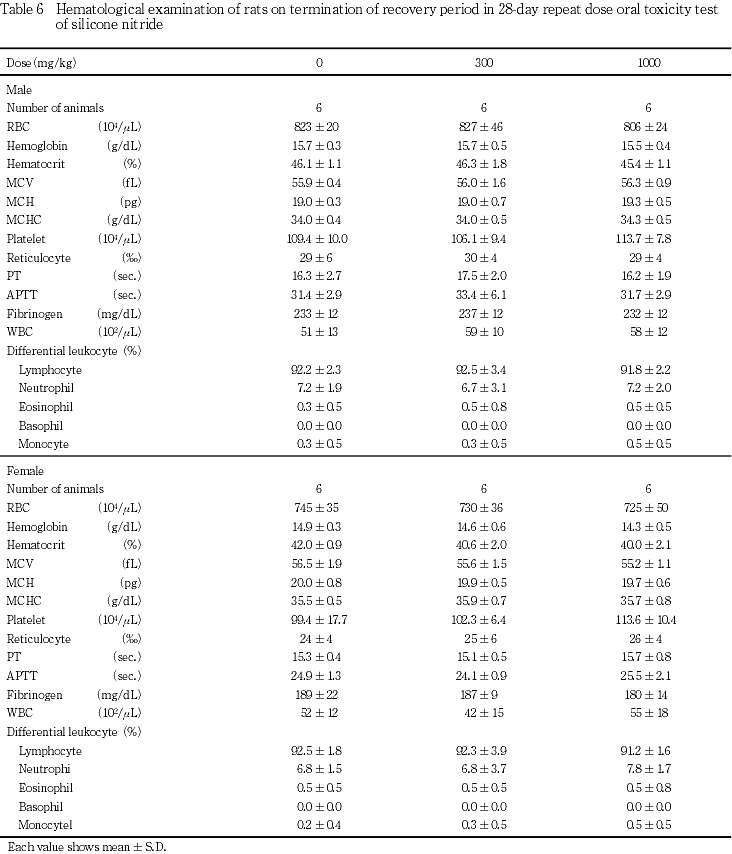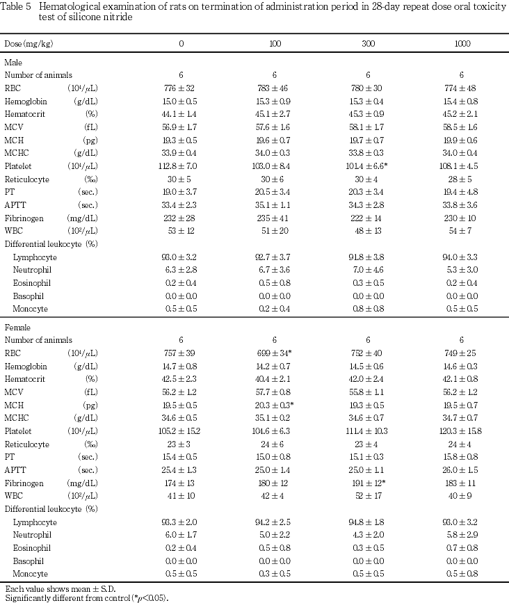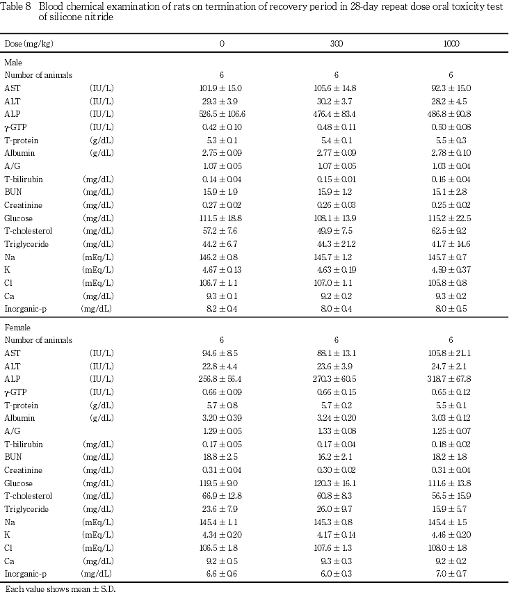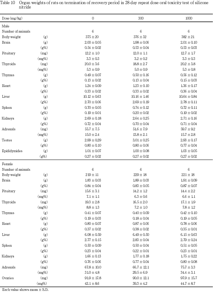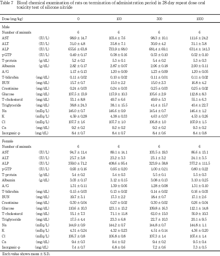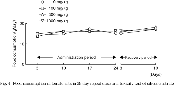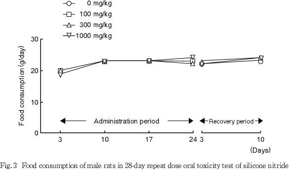 以上のことから,窒化ケイ素は雌雄とも1000 mg/kg投与しても毒性学的影響を生じないと判断される.したがって,当試験条件下における窒化ケイ素の毒性学的無影響量は,雌雄とも1000 mg/kg/dayと考えられる.