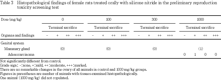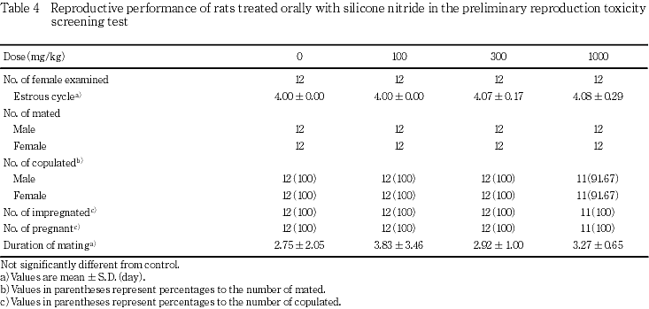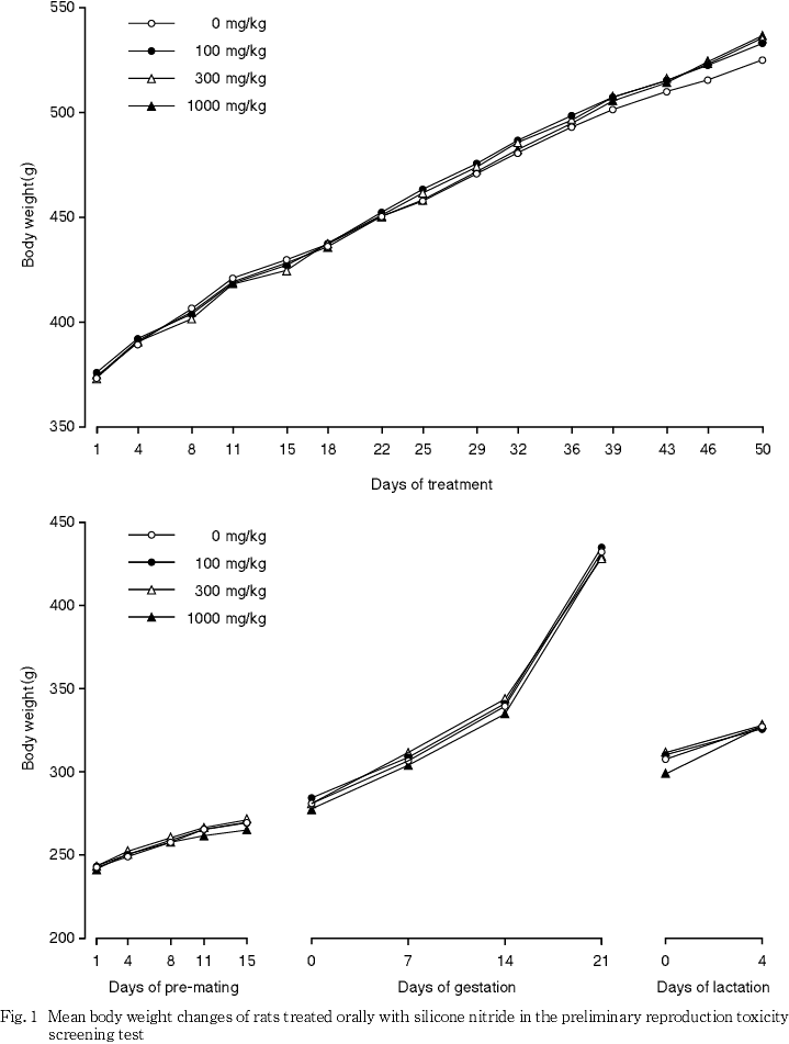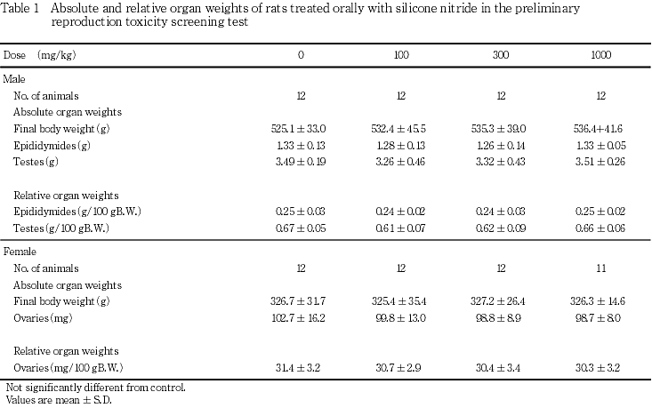 OECD既存化学物質安全性点検に係わる毒性調査の一環として,窒化ケイ素の0(媒体対照),100,300および1000 mg/kg/dayをCrj:CD(SD系)IGSラットの雌雄(各12匹/群)に交配前14日間,雄ではその後交配期間を含む35日間,雌では交配期間,妊娠期間および哺育3日まで通して経口投与し,親動物に対する反復投与毒性および生殖能力ならびに次世代児の発生・発育に及ぼす影響について検討した.