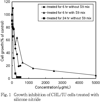 その結果,窒化ケイ素の約50 %の増殖抑制を示す濃度を,生存曲線において細胞増殖率が50 %前後を示す2点を結ぶ直線式より算出したところ,短時間処理法のS9 mix存在下で387 μg/mL,S9 mix非存在下で187 μg/mL,連続処理法24時間処理で70 μg/mLであった(Fig. 1).