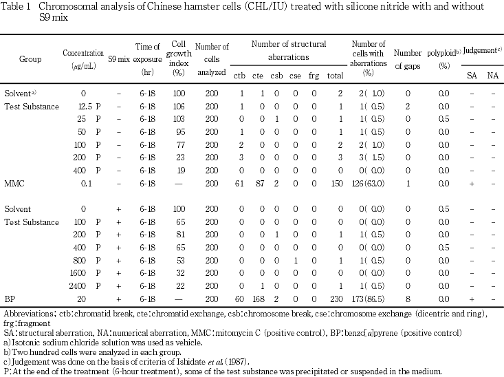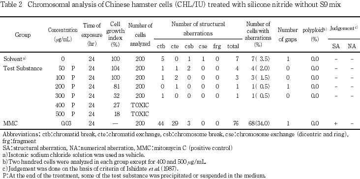 以上の結果から,窒化ケイ素は本試験条件下において,染色体異常を誘発しないと結論した.