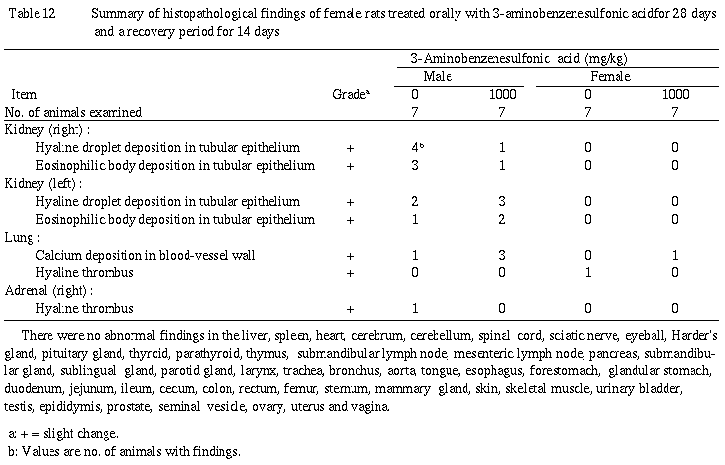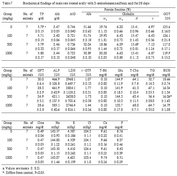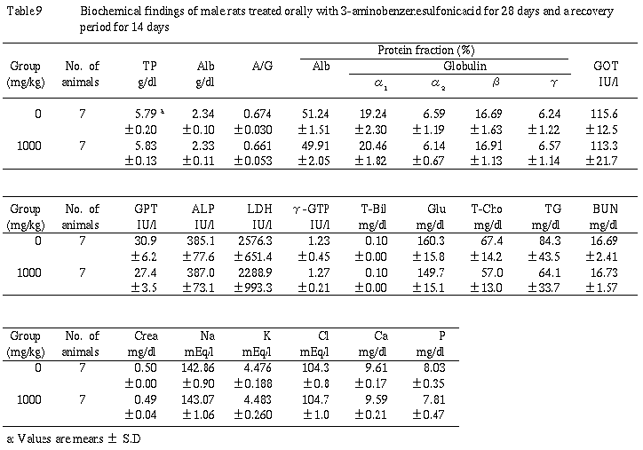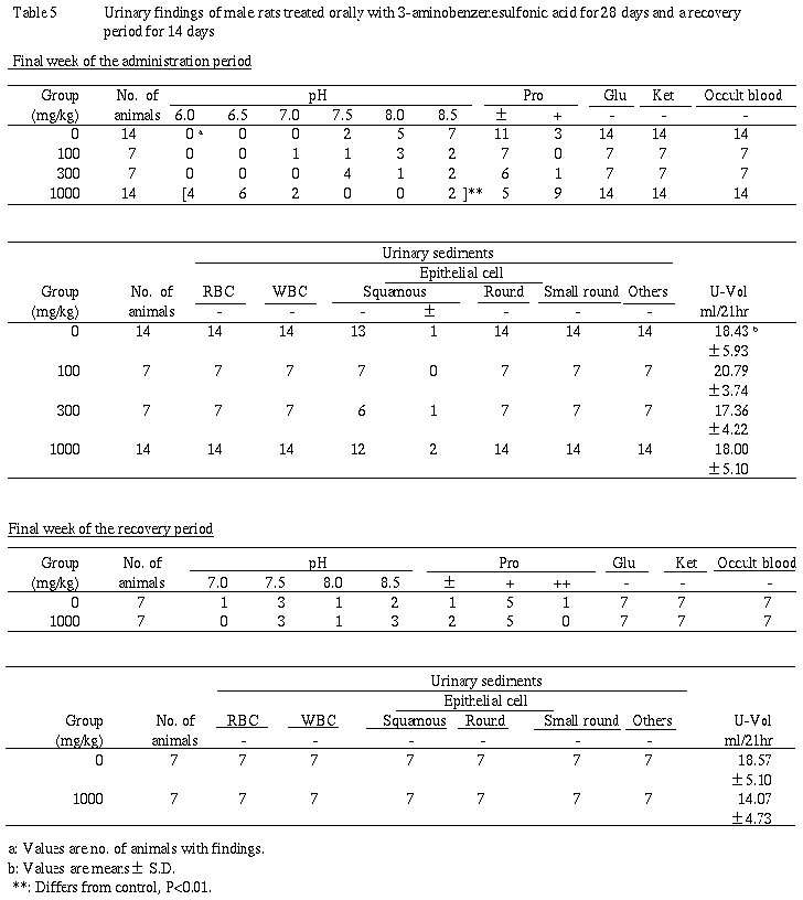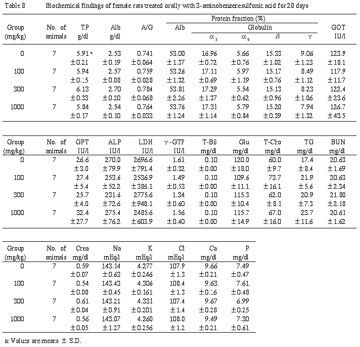 以上より,本試験における3-アミノベンゼンスルホン酸投与による無影響量(NOEL)は雌雄ともに300mg/kg/dayであると考えられた.