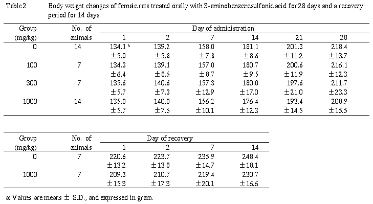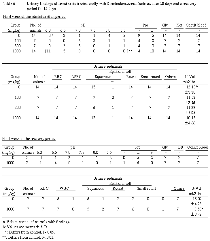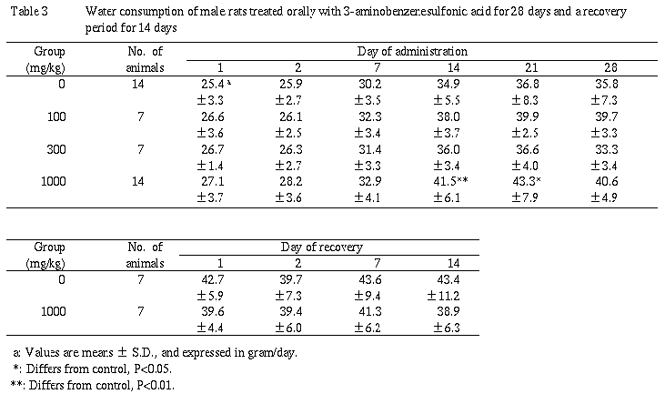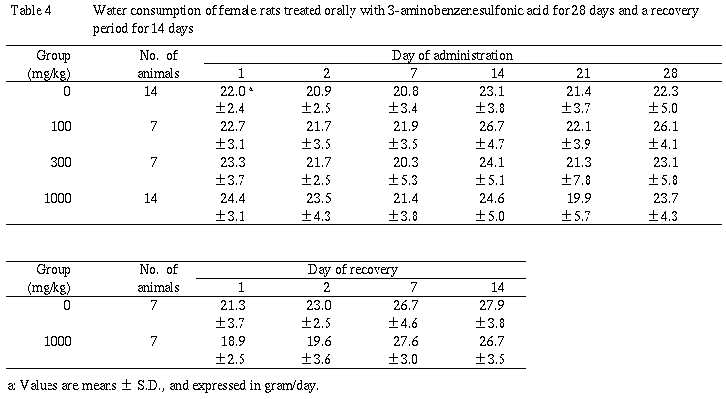 飲水量の増加が1000mg/kg群の雄で投与期間の後期に,また,尿pHの低下が1000mg/kg群の雌雄に認められたが,これらの変化は14日間の休薬により消失し,回復性があることが確認された.その他に一般状態観察,体重推移,摂餌量,血液学的検査,血液化学的検査,器官重量,剖検および病理組織学的検査では,被験物質投与による影響は認められなかった.以上のことから,本試験における3-アミノベンゼンスルホン酸投与による無影響量(NOEL)は 雌雄ともに300mg/kg/dayであると考えられた.