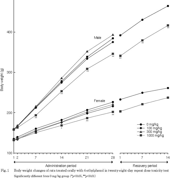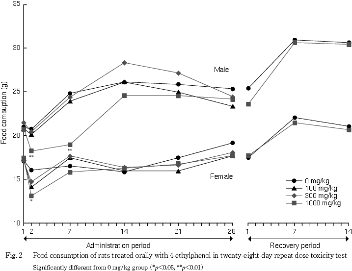 4-エチルフェノールは,反応性高分子(ポリパラビニルフェノール)原料,酸化防止剤,医薬品・農薬・染料などの原料として使用されている1).4-エチルフェノールを0(オリブ油),100,300および1000 mg/kgの投与量で,1群当たり雌雄各7あるいは14匹のCrj:CD(SD)IGSラットに28日間反復経口投与してその毒性を検討した.さらに,0および1000 mg/kg群の雌雄各7匹を用いて投与終了の翌日から14日間観察を継続して投与期間終了時にみられた毒性の回復性についても併せて検討した.