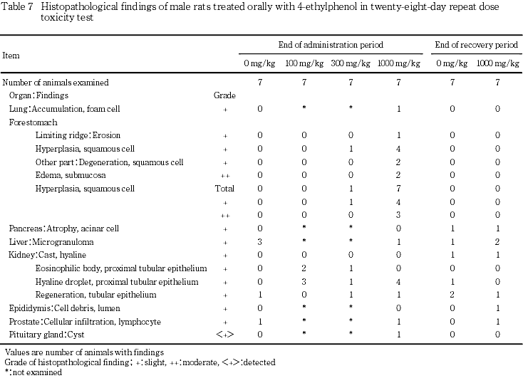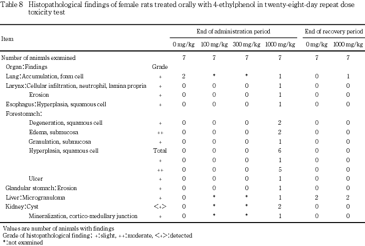 剖検では,前胃の粘膜肥厚が雌雄とも高頻度で発現し,病理組織学検査においても前胃に扁平上皮過形成が雄では全例に,雌では7例中6例にみられ,その他にびらん,扁平上皮の変性と粘膜下織の水腫,粘膜下織における肉芽形成または潰瘍等の変化がみられた.その他の消化管の病理組織学検査では雌で腺胃粘膜のびらん,喉頭の粘膜固有層における好中球浸潤,喉頭のびらん,食道の扁平上皮過形成が各1例認められた.これらの変化はいずれも,4-エチルフェノールが皮膚・粘膜に刺激性を持つ1)ことによるものと考えられた.回復期間終了時には,これらの変化は認められなかった.