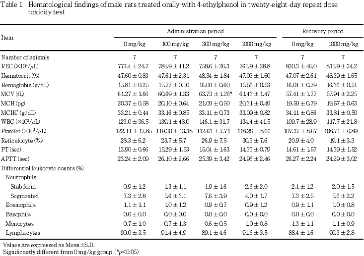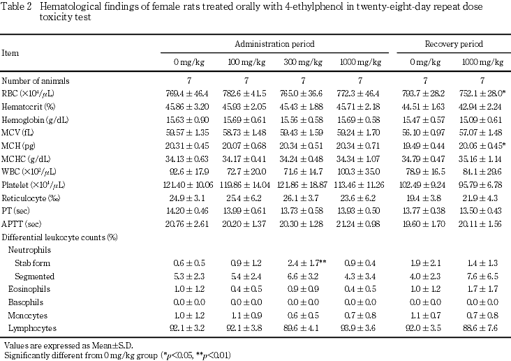 回復期間終了時には,1000 mg/kg群の雌で赤血球数の有意な低値および平均赤血球ヘモグロビン量の有意な高値がみられたが,いずれも偶発的な変化と考えられた.