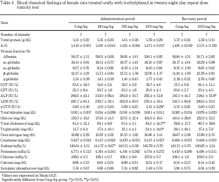 投与期間終了時の血液生化学検査で雄のGPTおよび雌の総コレステロールの高値がみられた.雄のGPTの高値は,用量設定試験でも認められているが,GOT,アルカリホスファターゼ,γ-GTP,総ビリルビン等の肝機能検査に変化がないことから,肝障害に基づく変化ではないと考えられた.総コレステロールの高値は,用量設定試験では雄に,本試験では雌に認められ,4-エチルフェノールが脂質代謝系に対して影響を及ぼす可能性が考えられた.回復期間終了時には,投与期間終了時に変化のみられた項目にはいずれも異常はなく,回復性が認められた.