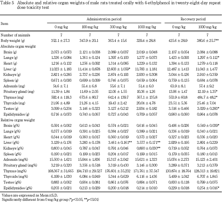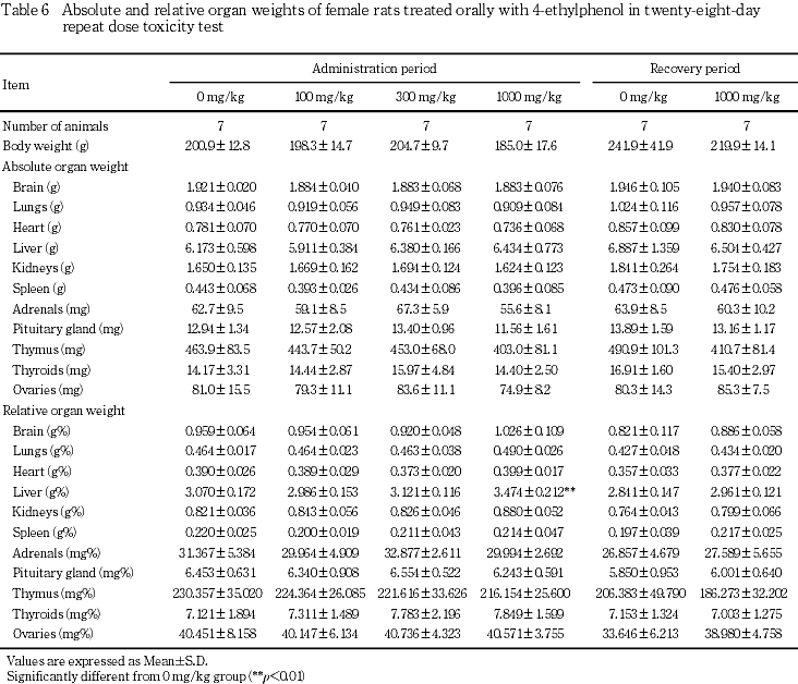 器官重量は,投与期間終了時に雌雄の肝臓の重量および相対重量に高値傾向または高値がみられた.雄では,さらに腎臓の相対重量に有意な高値がみられた.しかし,雌雄の肝臓および雄の腎臓には4-エチルフェノール投与に起因すると考えられる病理組織学的異常は認められなかった.回復期間終了時に雄で肺,下垂体,胸腺および精巣の絶対重量の低値,脳および精巣上体の相対重量の高値がみられたが,体重の低値に伴った変化と考えられた.