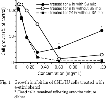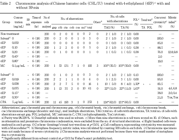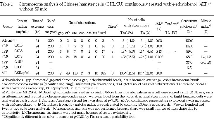 以上の結果より,本試験条件下で4-エチルフェノールは,染色体異常を誘発する(陽性)と結論した.