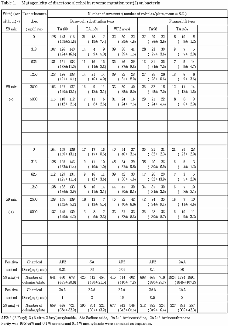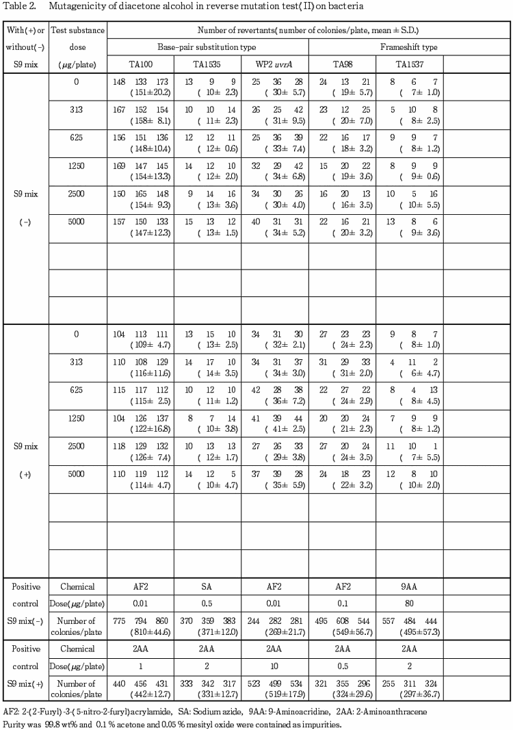 以上の結果に基づき,ジアセトンアルコールは,用いた試験系において変異原性を有しない(陰性)と判定した.