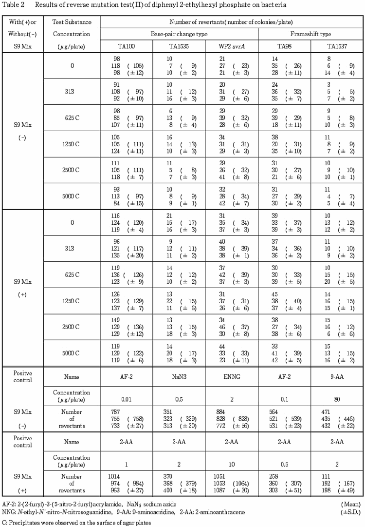 以上の結果より,本試験条件下ではリン酸(2-エチルヘキシル)ジフェニルエステルは,変異原性を有さない(陰性)と判定された.