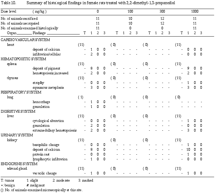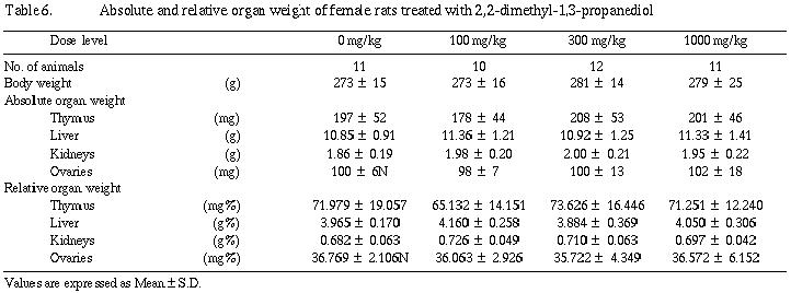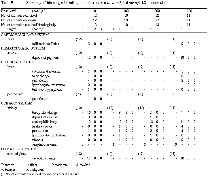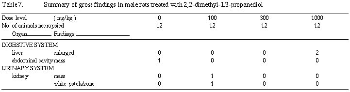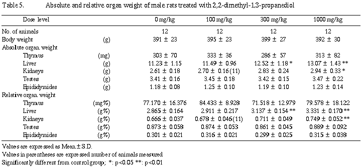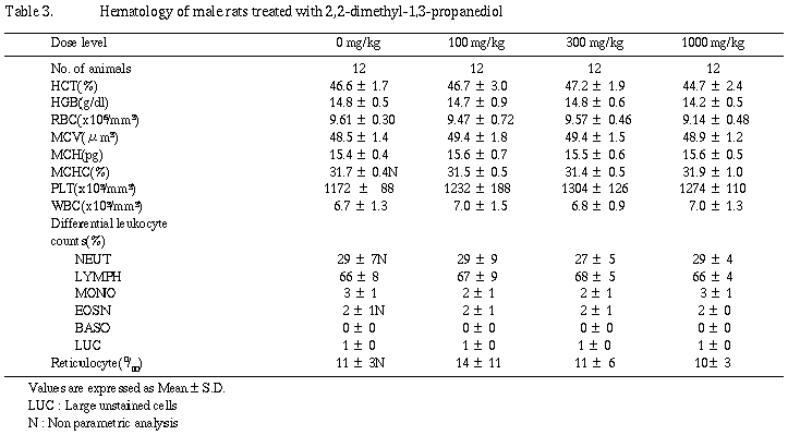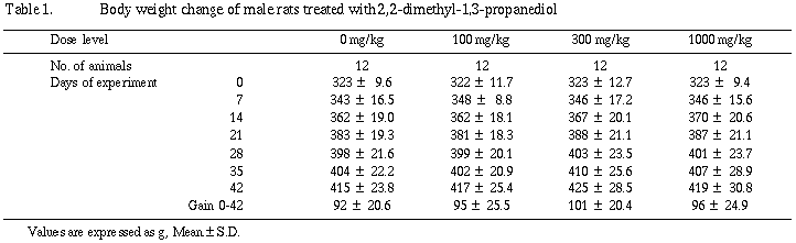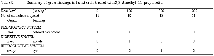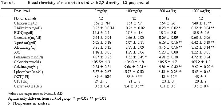 以上のことから、2, 2−ジメチル−1, 3−プロパンジオールは、300 mg/kg/day以上の投与で雄の場合、肝臓および腎臓重量の増加または増加傾向、また、1,000 mg/kg/day投与でアルブミンの増加に伴う総蛋白の増加および総ビリルビンの増加、血糖値の減少、腎臓の蛋白円柱、硝子滴変性数の増加または増加傾向、尿細管上皮の好塩基性化の程度の増強および肝臓の肥大を誘起した。雌では1,000 mg/kg/day投与によっても認められなかった。したがって、反復投与毒性の最大無影響量は、雄では100 mg/kg/day、雌では1,000mg/kg/dayと判断された。
