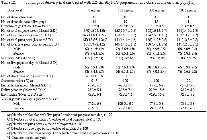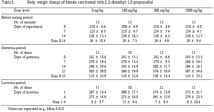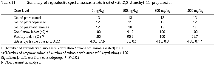 以上のことから、2, 2−ジメチル−1, 3−プロパンジオールの雌雄の生殖に及ぼす影響および児動物の発生に及ぼす影響は、1,000 mg/kg/day投与によっても認められず、最大無影響量はともに1,000mg/kg/dayと判断された。