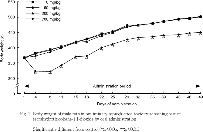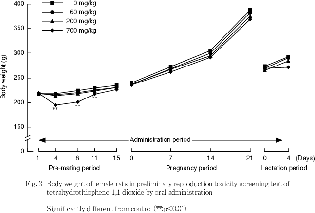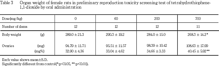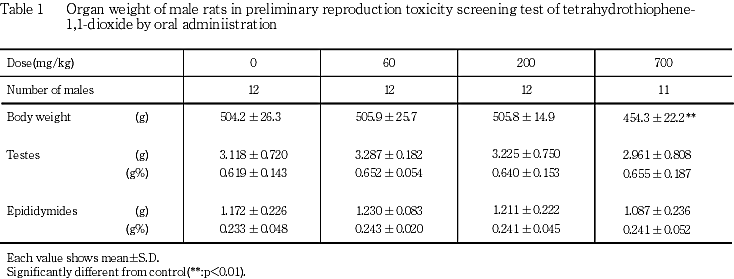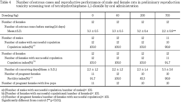 テトラヒドロチオフェン-1,1-ジオキシドのラットを用いる経口投与簡易生殖毒性試験を行い,雌雄親動物の生殖能力および次世代児の発生・発育に及ぼす影響について検討した.投与量は,700 mg/kgを最高用量とし,以下200および60 mg/kgとした.対照として媒体(注射用水)投与群を設けた.