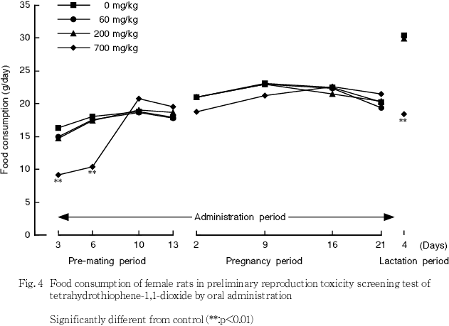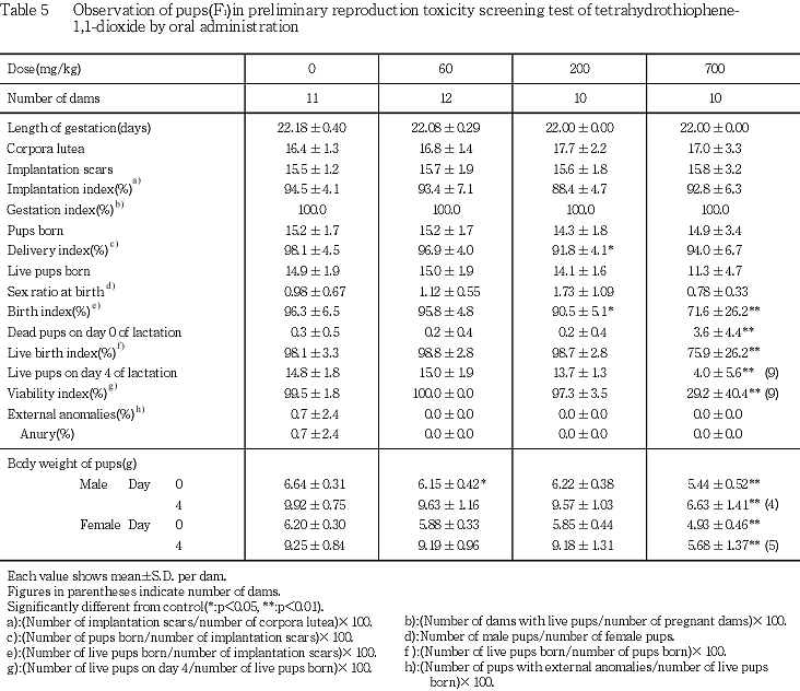 以上のように,テトラヒドロチオフェン-1,1-ジオキシドの一般毒性学的無影響量は,雌雄とも700 mg/kg投与により死亡例の発現,体重の増加抑制および摂餌量の低値が認められたことから200 mg/kg/dayと考えられる.また,生殖発生毒性学的な無影響量は,雄では700 mg/kg投与しても交尾率および受胎率に影響は認められなかったことから700 mg/kg/day,雌では700 mg/kg投与により新生児が全例死亡した母動物が認められたことから200 mg/kg/day,児動物では200 mg/kg投与により児の産出率の低値,哺育0および4日の新生児数の低値傾向が認められたことから60 mg/kg/dayと考えられる.
