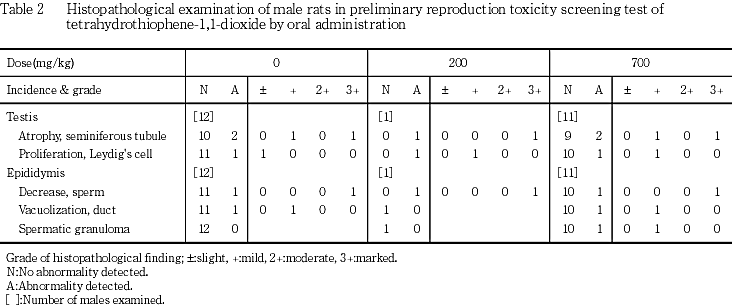 したがって,当試験条件下におけるテトラヒドロチオフェン-1,1-ジオキシドの一般毒性学的無影響量は,雌雄とも200 mg/kg/dayと考えられる.