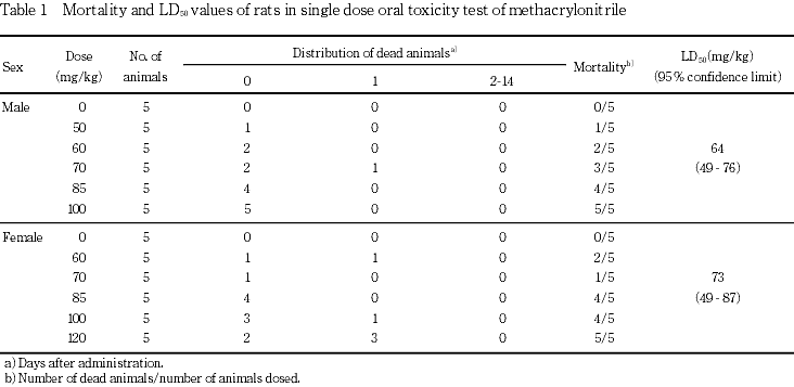 プラスチック,エラストマー,単重合体,共重合体,被覆剤等の合成に使用され,酸,アミド,アミン,エステル,ニトリル等の合成時には化学反応中間体として,また特殊な用途としては炭酸飲料容器の製造時にアクリロニトリルの置換剤としても使用されているメタクリロニトリル を,オリブ油に溶解させて,1群あたり雌雄各5匹のCrj:CD(SD)IGSラットの雄に0,50,60,70,85および100 mg/kg,雌に0,60,70,85,100および120 mg/kgの投与量で単回経口投与してその急性毒性を検討し,以下の成績を得た.死亡は雌雄とも投与後1日までに0 mg/kgを除く各投与群で認められた.一般状態では,投与日に0 mg/kgを除く各投与群で,自発運動の減少,腹臥または横臥ならびに呼吸促迫が投与後数分から2時間の間に発現した.その他に,間代性痙攣,流涎,下痢ならびに外尿道口周囲,肛門周囲および口周囲の被毛の汚れも観察された.体重では,雌の70および85 mg/kg投与群で投与後1日に体重減少が認められたが,その後の推移は対照群と変わらなかった.剖検では,雌雄の死亡例に肺の明橙色化および右心房の拡張がみられ,他に腺胃粘膜の暗赤色斑,小腸の淡赤色化を伴う例も認められたが,雌雄の生存例には異常は認められなかった.LD50値(95 %信頼限界)は,雄で64(49〜76)mg/kg,雌で73(49〜87)mg/kgであった.