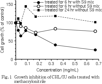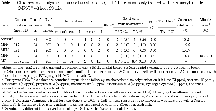 メタクリロニトリルのメチル基が水素に置換しているアクリロニトリルは,代謝活性化の有無に関係なく染色体の構造異常を誘発するが,倍数性細胞を誘発しないことが報告されている4).また,メタクリロニトリルのニトリル基がメチルエステルに置換しているメチルメタクリラートは染色体の構造異常を誘発するが,その作用は弱い5).これらのことから,化学構造が類似したこれらの3物質は,ともに染色体の構造異常を誘発するがその作用機序が異なる可能性が示唆された.