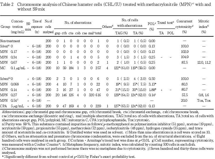 以上の結果より,本試験条件下でメタクリロニトリルは,染色体異常を誘発する(陽性)と結論した.