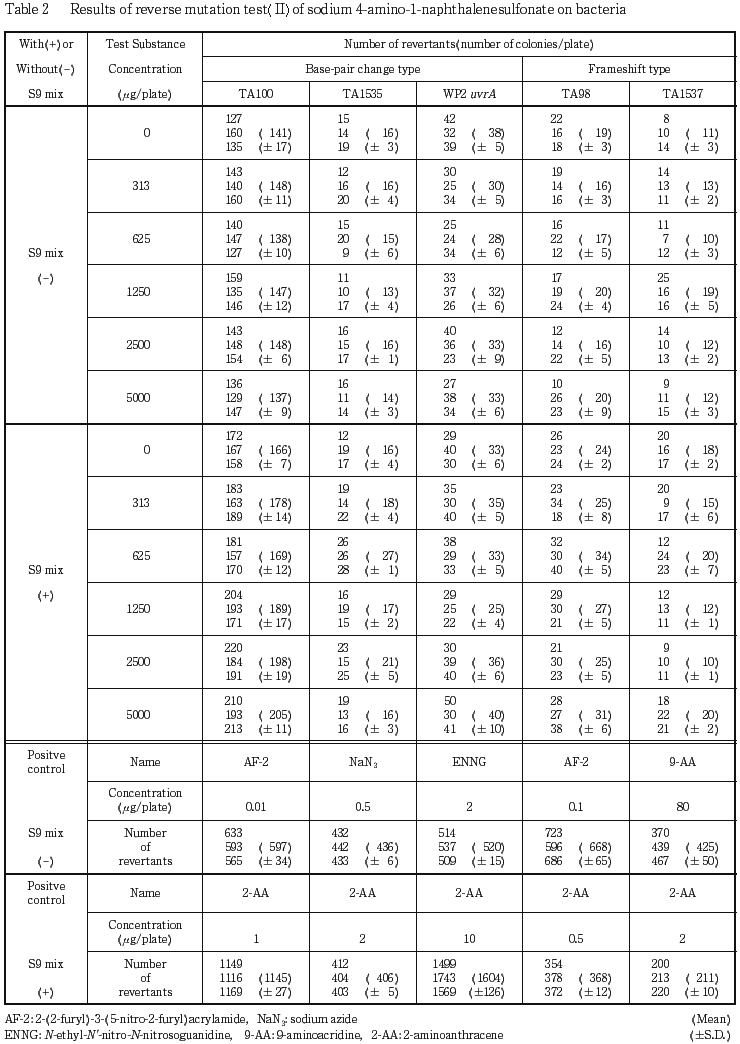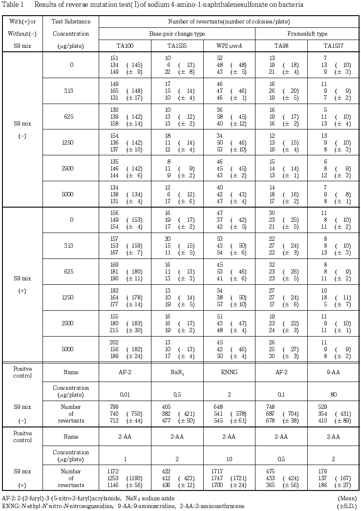 本試験を2回実施した結果,被験物質の各濃度において誘発された復帰変異コロニー数は,S9 mixの有無によらず,いずれの菌株においても陰性(溶媒)対照値の2倍以上を示さなかった.また,S9 mixの有無によらず,いずれの菌株においても抗菌性は認められなかった.従って4-アミノ-1-ナフタレンスルホン酸ナトリウムの変異原性は陰性と結論した.