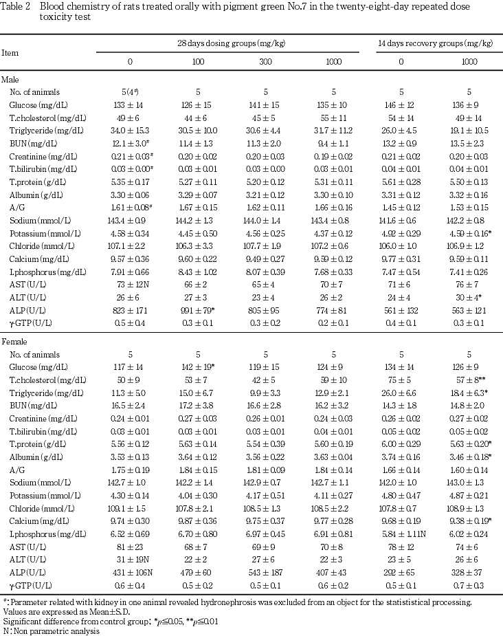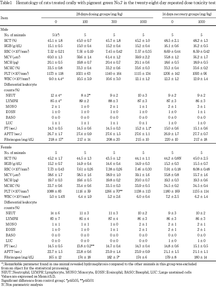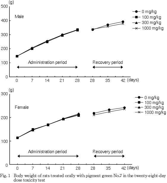 ピグメントグリーンNo. 7についてSD系のラットを用い,0,100,300および1000 mg/kgの用量で28日間反復経口投与毒性試験を実施した.なお,対照群および1000 mg/kg群にはそれぞれ雌雄各5匹の14日間回復群を設けた.
