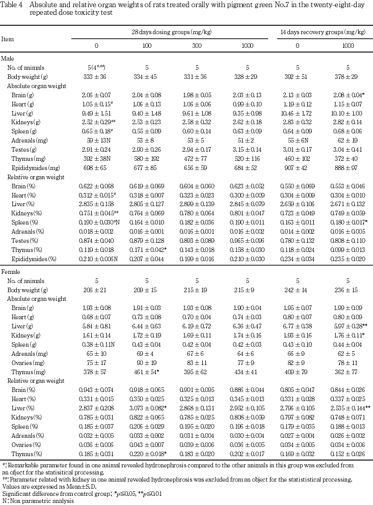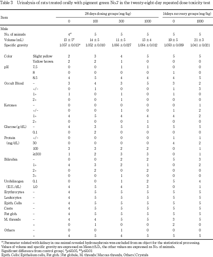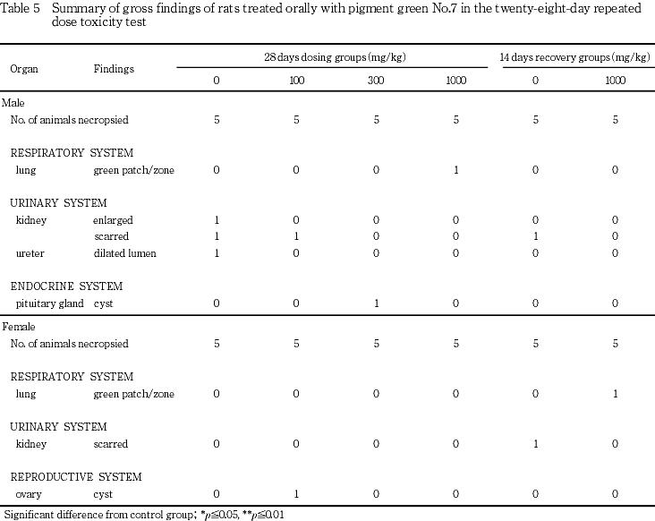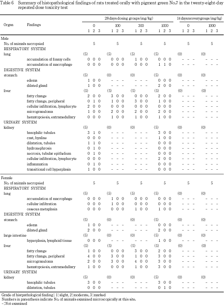 以上の結果,ピグメントグリーンNo. 7の毒性は雌雄いずれの投与群にも認められなかったことから無影響量は雌雄とも1000 mg/kgと判断された.