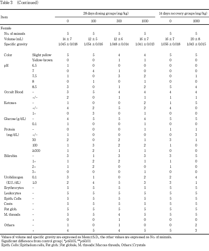 投与期間終了週および回復期間終了週の計2回実施した.採尿器を用いて約3時間および約24時間の尿を採取し,3時間尿を用いてpH,潜血,ケトン体,糖,蛋白,ビリルビンおよびウロビリノーゲンについて,試験紙(N-マルティスティックスSG,バイエル・三共(株))および尿分析装置(CLINITEK500,バイエル社)で測定した.また,24時間尿を用いて,尿量および色調を検査後,尿比重計UR-S((株)アタゴ)で尿比重を測定するとともに,尿を遠心分離後Sternheimer変法により沈渣を染色し,鏡検した.