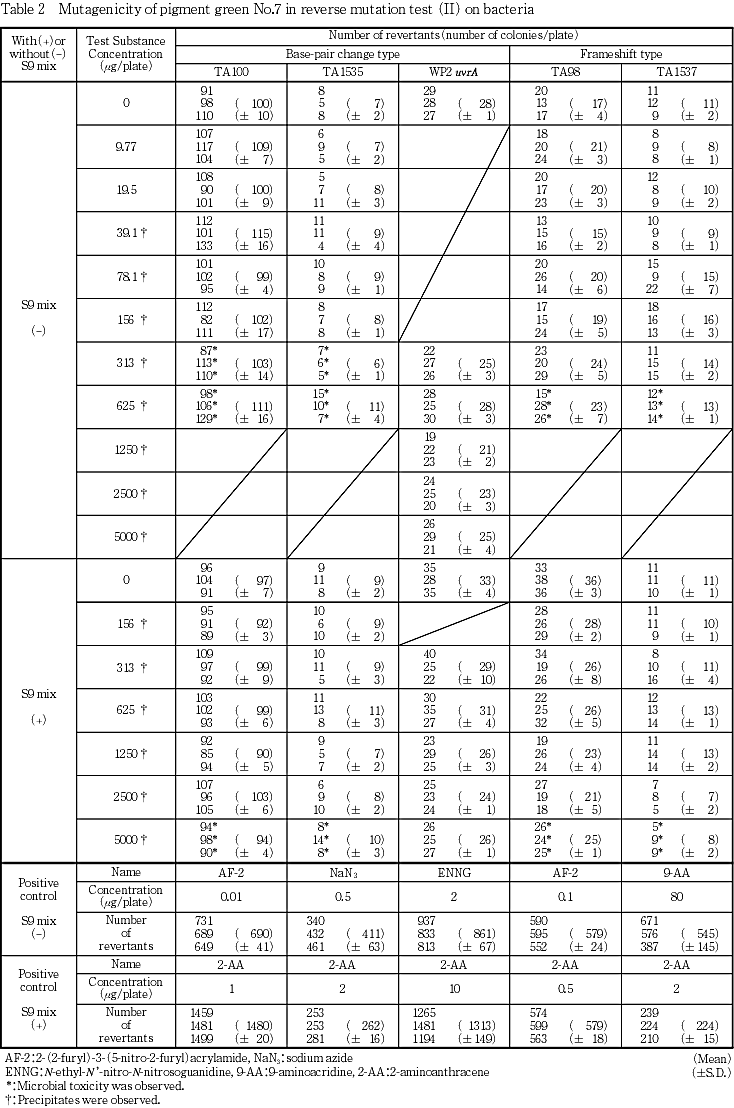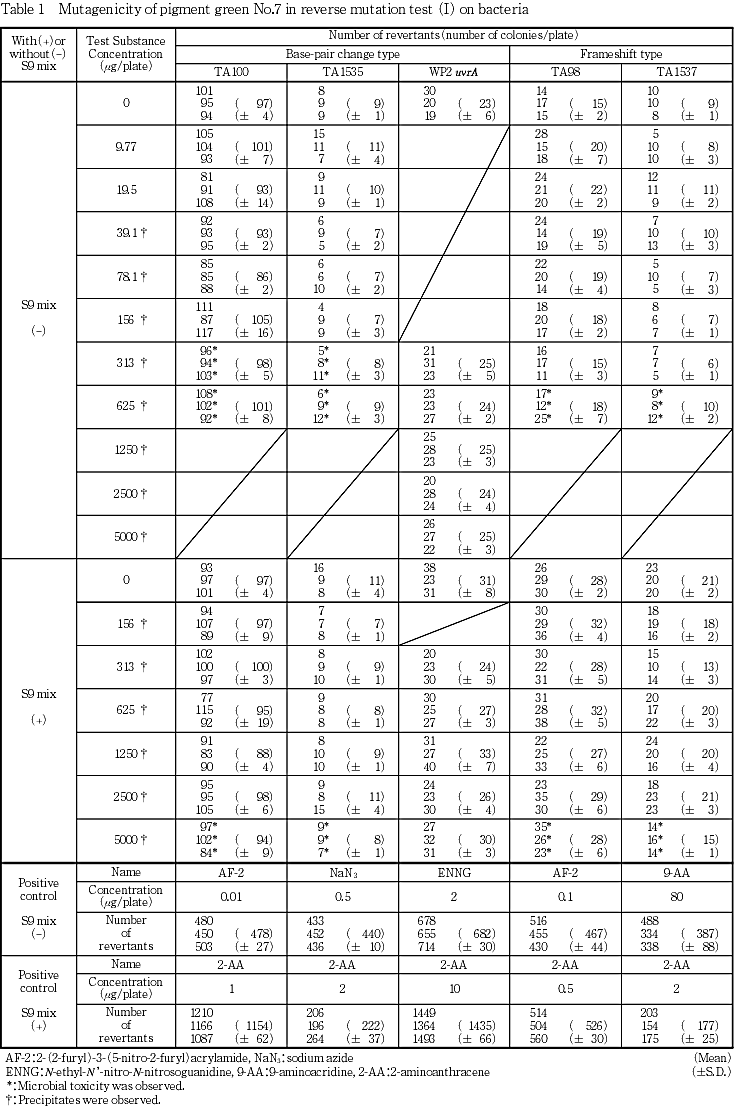 以上の結果から,ピグメントグリーンNo. 7は本試験系において変異原性を有さない(陰性)と判定した.