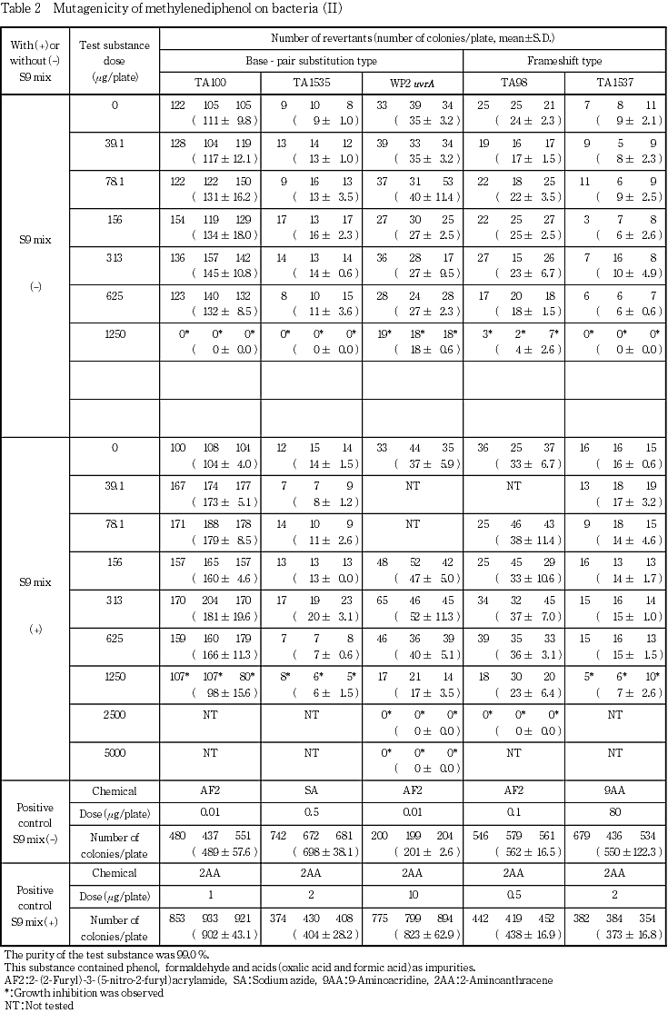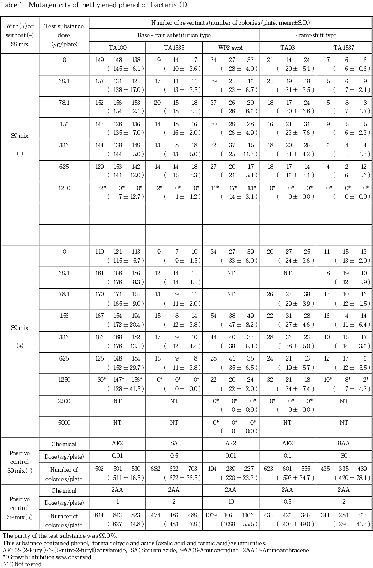 以上の結果からメチレンジフェノールは,用いた試験系において変異原性を有しないもの(陰性)と判定した.