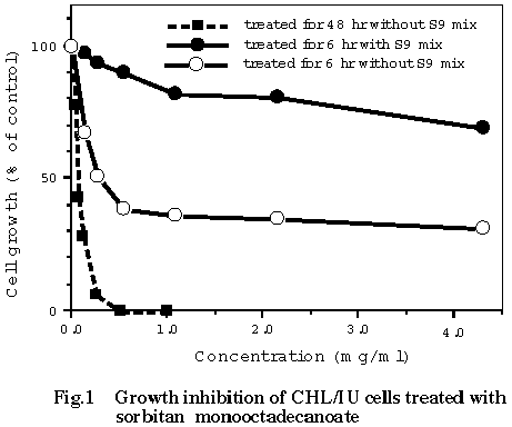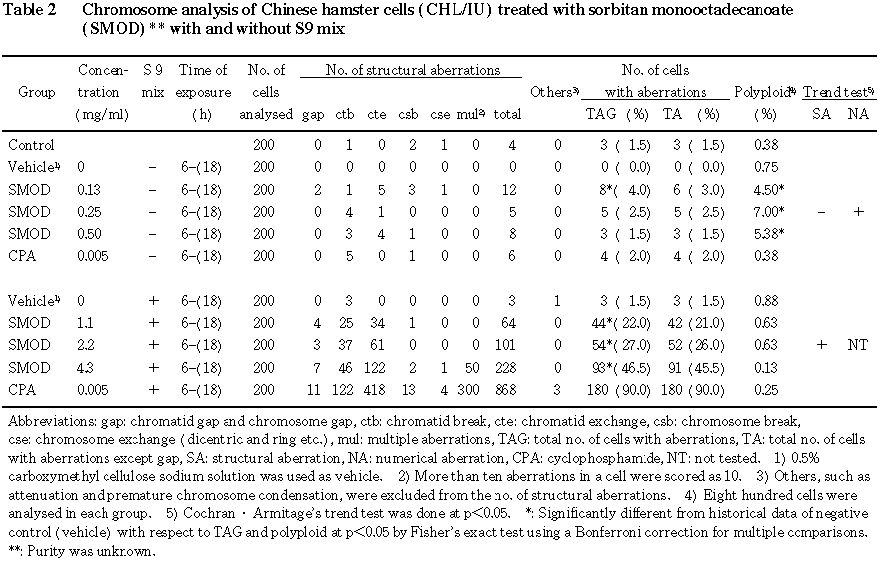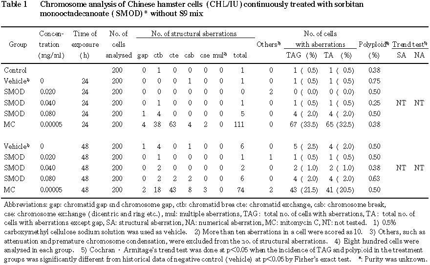 従って,ソルビタンモノオクタデカノアートは,試験管内の CHL/IU細胞に染色体異常を誘発すると結論した.
