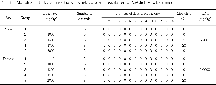 したがって,N,N-ジエチル-m-トルアミドのLD50値は雌雄とも2000 mg/kg以上であると推定された.