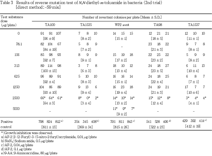 以上の成績から,本実験条件下では,N,N-ジエチル-m-トルアミドの遺伝子突然変異誘発性は陰性と判定した.