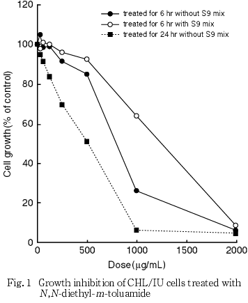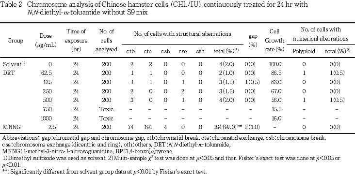 以上の成績から,N,N-ジエチル-m-トルアミドのCHL/IU細胞に対する染色体異常誘発性は陰性と判定した.