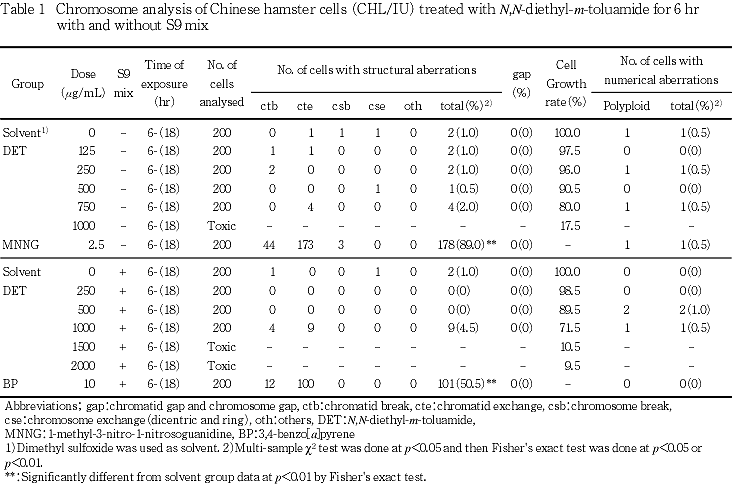 したがって,N,N-ジエチル-m-トルアミドの CHL/IU 細胞に対する染色体異常誘発性は陰性と判定した.本試験結果は,CHL/IU 細胞において,染色体異常を有する細胞の出現頻度が5 %未満を陰性とする石館らの判定基準2)からみても,明らかに陰性と判断されるものであった.