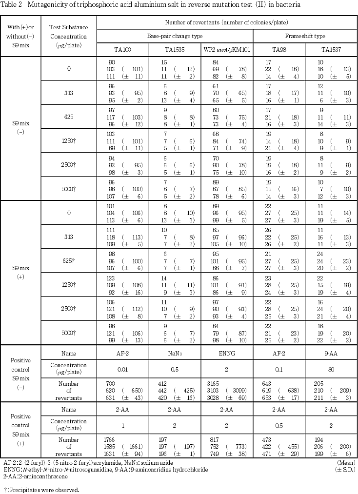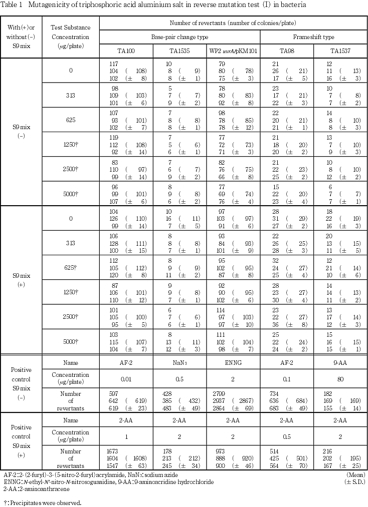 以上の結果から,トリリン酸アルミニウム塩は本試験系において変異原性を有さない(陰性)と判定した.