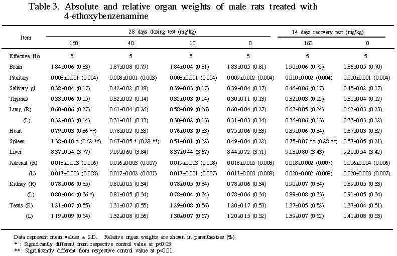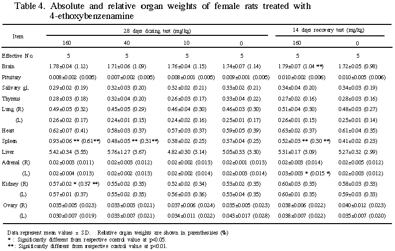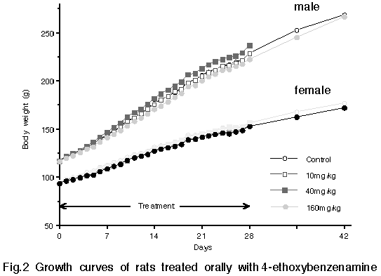 10 mg/kg群では雌雄とも、いずれの項目においても対照群と比較し有意な変化は認められず、本実験条件下における4−エトキシベンゼナミンの無影響量は10 mg/kg/dayと考えられた。