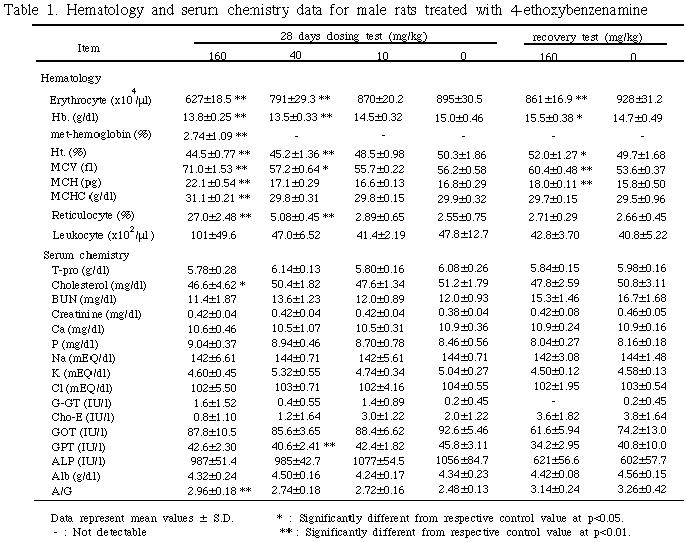 4−エトキシベンゼナミンは医薬品フェナセチンの代謝物として知られている7, 8, 9)。フェナセチンは下熱鎮痛剤として用いられていたが、血液障害等の副作用がある、また、発がん性の危険性も報告されたことから現在ではあまり用いられていない薬物である。フェナセチン投与による血液障害(メトヘモグロビン血症)はおもにその代謝物であるp-phenetidine(N-hydroxy-p-phenetidine)によるものと報告されている7, 8, 9)。また、アニリン色素投与によるメトヘモグロビン血症も広く報告されている10)。本研究において4−エトキシベンゼナミン投与によりメトヘモグロビン血症が認められたことはこれらの報告と一致するものであった。