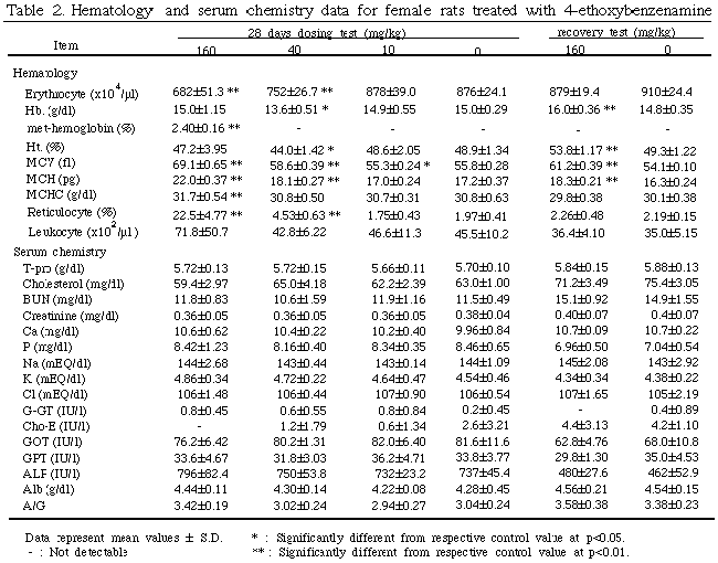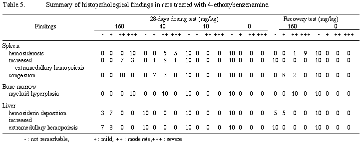 脾臓および肝臓におけるヘモジデリンの沈着は、これらの臓器におけるメトヘモグロビン赤血球の処理(崩壊)によるものと考えられた。一方、網状赤血球数の増加・骨髄の造血亢進・脾臓および肝臓における髄外造血の亢進は血球崩壊による赤血球数の減少(貧血)を補うための代償性反応として発現したものであり、4−エトキシベンゼナミンの造血系に対する直接的な障害作用によるものではないと考えられた。また、尿中ウロビリノーゲンの増加もヘモグロビン分解量の上昇に起因した反応と考えられた。本物質により惹起された変化はいずれも14日間の休薬により回復または回復傾向を示しており、これらの変化は可逆性と考えられた。