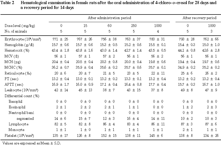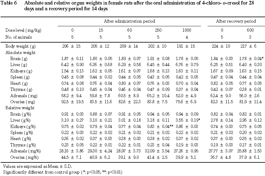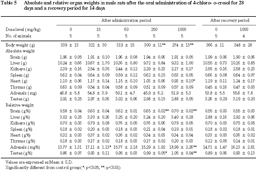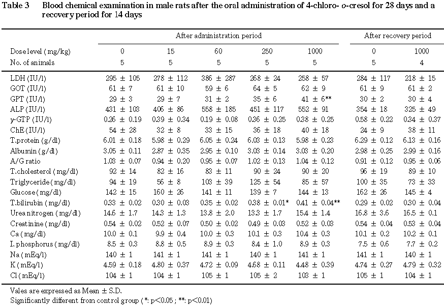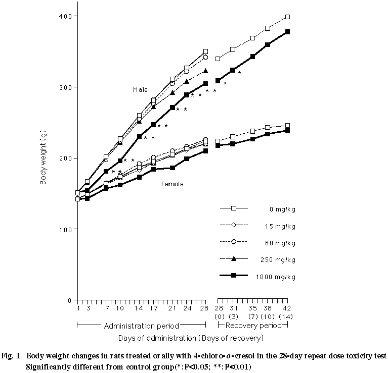 4-クロロ-o-クレゾールの単回経口投与におけるLD50値は,1194 mg/kgと報告されている1).投与量設定試験を,ラットを1群雌雄各4匹とし,0,10,30,100,300および1000 mg/kg/day用量の14日間反復経口投与により実施した.剖検で,前胃粘膜の肥厚が300 mg/kg以上の群の雌雄に認められた.1000 mg/kg群では,自発運動低下,流涎,深大呼吸,筋弛緩,腹臥姿勢などの症状,体重増加の抑制,摂餌量の減少傾向,肝臓重量の増加が雌雄に認められた.尿検査,血液学検査,血液生化学検査では,明らかな変化は認められなかった.したがって,本試験における投与量は,1000 mg/kg/dayを最高用量とし,以下250,60,15 mg/kg/dayの4用量および対照を設定した.試験群は,以上の5群の他に,1000 mg/kgおよび対照の14日間回復群を設けた.投与は,胃ゾンデを装着した注射筒を用いて,投与液を1日1回,28日間にわたって経口投与した.投与液量は,体重100 g当たり0.5 mlとした.対照群には局方ゴマ油を同様に投与した.