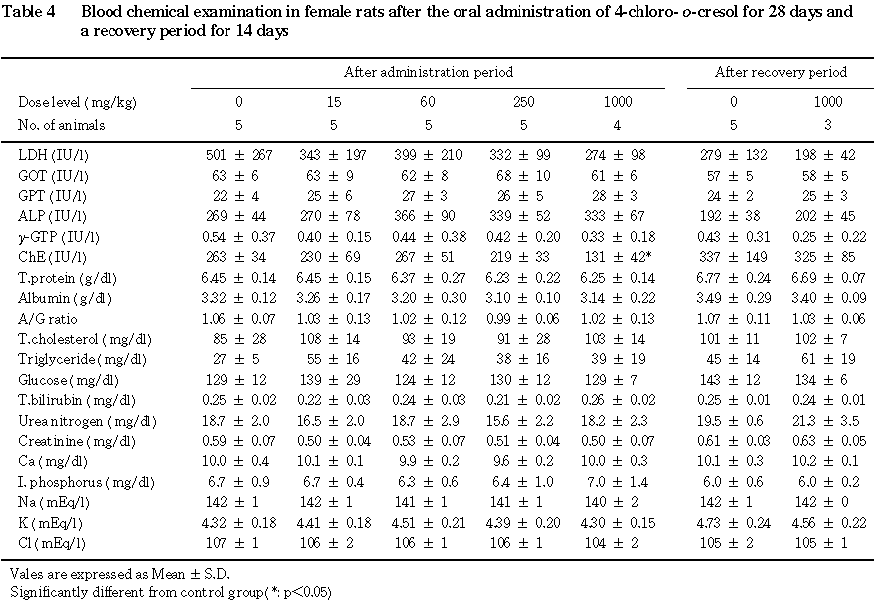 4-クロロ-o-クレゾールの28日間反復経口投与毒性試験をSD系[Crj:CD(SD)]ラットを用い,0(対照),15,60,250および1000 mg/kg/day用量の投与により実施した.動物数は1群雌雄各5匹とし,7群を設け,5群は投与期間終了時屠殺群,2群は対照および1000 mg/kgの14日間回復群とした.