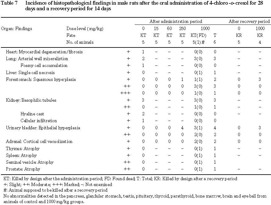 被験物質の投与に起因すると考えられる変化が,胃,膀胱,肝臓および副腎に認められた.投与期間終了後屠殺動物において,胃では,前胃の粘膜に扁平上皮の過形成が,