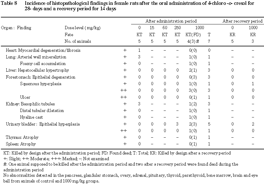 4-クロロ-o-クレゾールのラットを用いた28日間の反復経口投与毒性試験では,消化管,特に胃および膀胱の粘膜,肝臓,腎臓,副腎などに変化が発現した.
