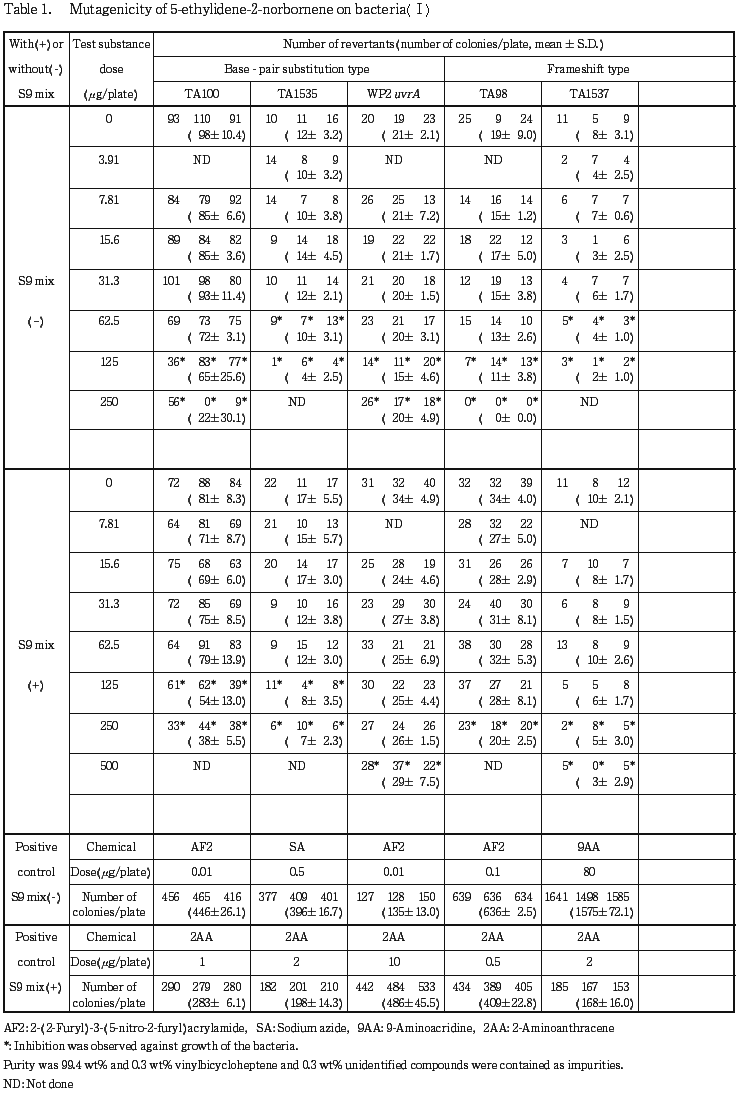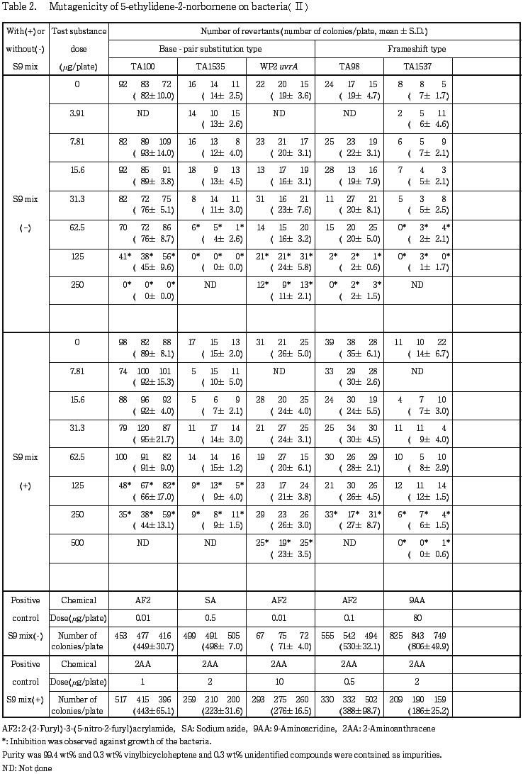 以上の結果から,5-エチリデン-2-ノルボルネンは,用いた試験系において変異原性を有しないもの(陰性)と判定した.