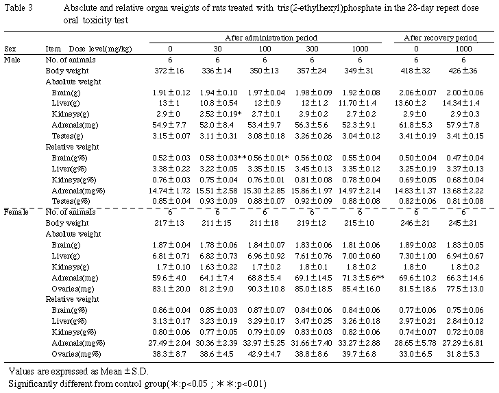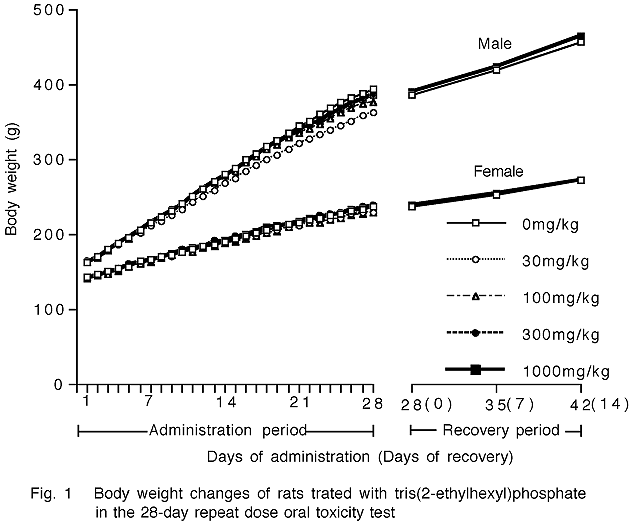 塩ビペーストや合成ゴムなどの耐寒性可塑剤として用いられている既存化学物質リン酸トリス(2-エチルヘキシル)の28日間反復投与毒性試験を,SD系[Crj:CD(SD)]ラットを用い,0(対照),30,100,300および1000mg/kg/day用量の経口投与により実施した.動物数は1群雌雄各6匹とし,7群を設け,5群は投与終了後屠殺群,2群は対照および1000mg/kgの14日間回復群とした.