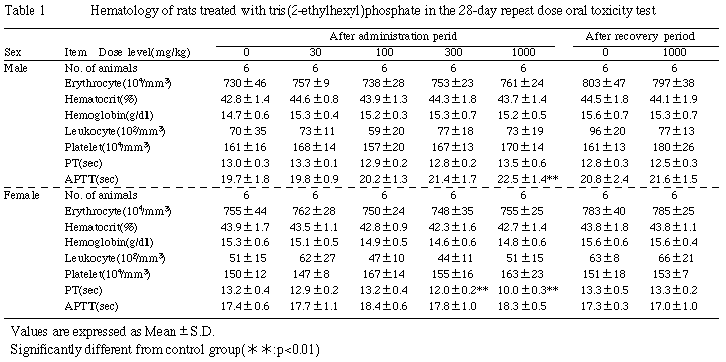 プロトロンビン時間の用量依存的,かつ,有意な短縮が300mg/kg以上の群の雌に,活性化部分トロンボプラスチン時間の有意な延長が100mg/kg群の雄に認められた.回復群では,各検査項目に対照群と比べて有意な変化は認められなかった.