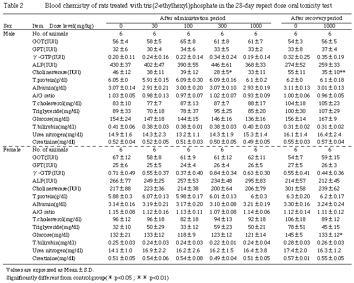 以上の結果から,リン酸トリス(2-エチルヘキシル)は,ラットの血液凝固系や血清コリンエステラーゼ活性に対し軽度な影響を有し,その無影響量は100mg/kg/dayと推定された.