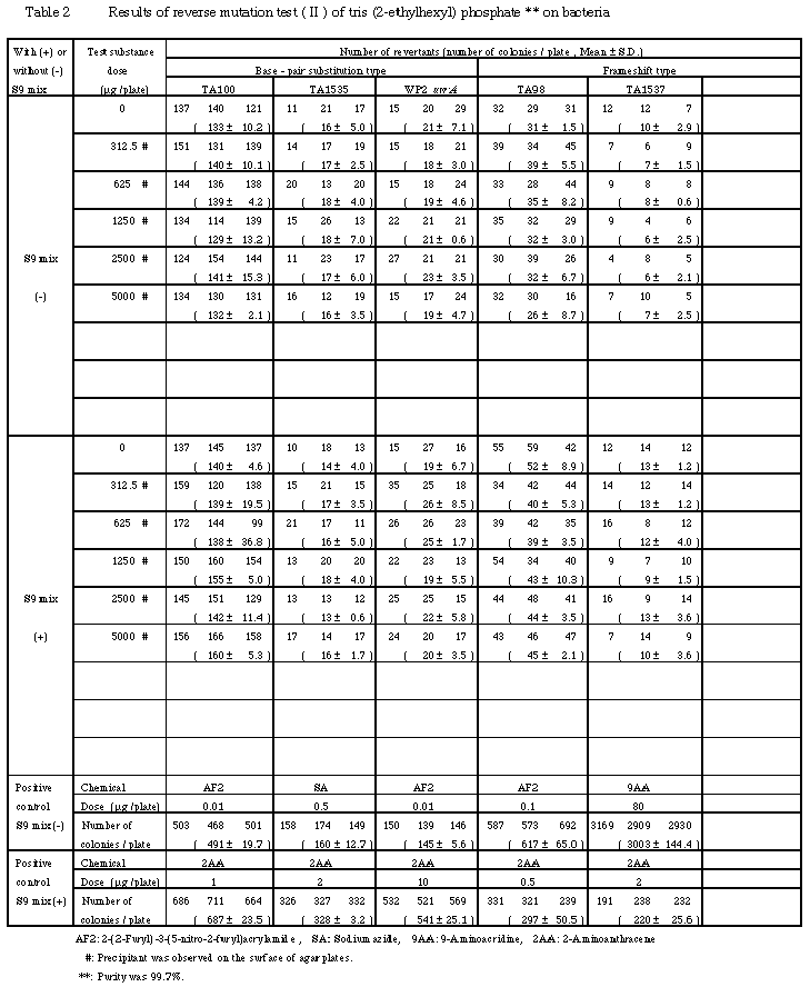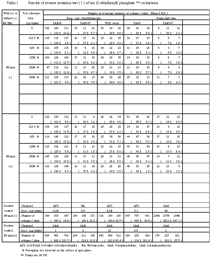 以上の結果に基づき,リン酸トリス(2-エチルヘキシル)は,用いた試験系において変異原性を有しないもの(陰性)と判定した.