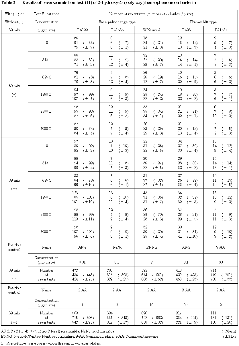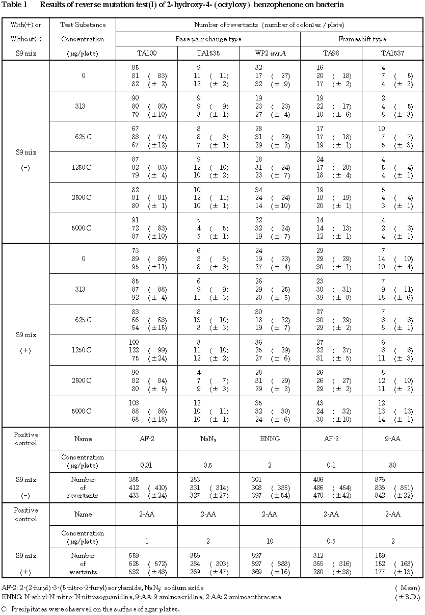 以上の結果から, 2-ヒドロキシ-4-(オクチルオキシ)ベンゾフェノンの変異原性は陰性と結論した.